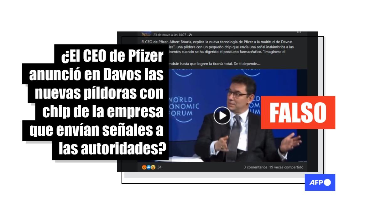“El CEO de Pfizer, Albert Bourla, explica la nueva tecnología de Pfizer a la multitud de Davos: ‘píldoras ingeribles’, una píldora con un pequeño chip que envía una señal inalámbrica a las autoridades pertinentes cuando se ha digerido el producto farmacéutico. ‘Imagínese el cumplimiento’, [Ellos] no se detendrán hasta que logren la tiranía total. De ti depende....”, dice una de las publicaciones en Facebook (1, 2). El contenido también fue compartido en Instagram y Twitter.