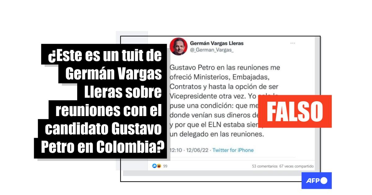 Los rastreos condujeron también a un tuit de Vargas Lleras publicado el 12 de junio de 2022, en el que denunció la suplantación de su cuenta y difundió una captura de pantalla del tuit viral tachada con la palabra "Falso".