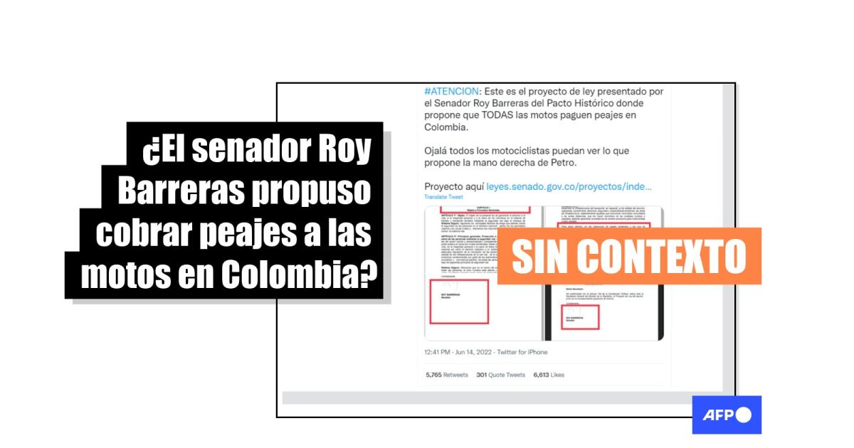 “#ATENCION: Este es el proyecto de ley presentado por el Senador Roy Barreras del Pacto Histórico donde propone que TODAS las motos paguen peajes en Colombia. Ojalá todos los motociclistas puedan ver lo que propone la mano derecha de Petro”, se lee en una de las entradas en Twitter (1, 2). El contenido también se ha compartido en Facebook (1, 2) y TikTok.