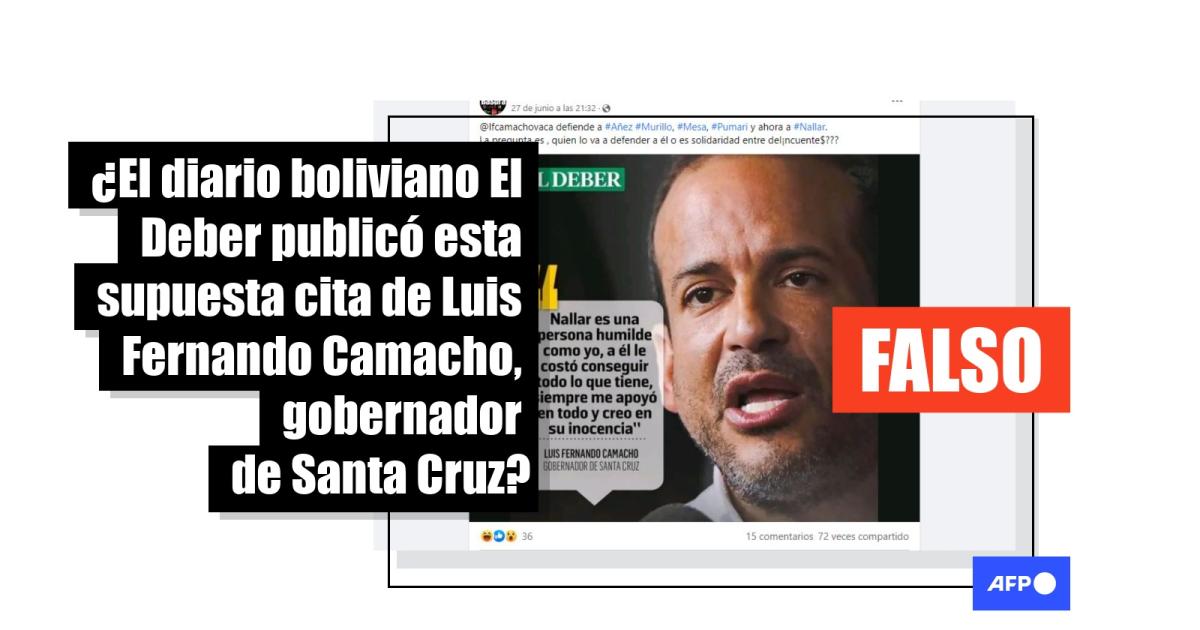 "Nallar es una persona humilde como yo, a él le costó conseguir todo lo que tiene, siempre me apoyó en todo y creo en su inocencia", dice la frase atribuida al gobernador de Santa Cruz, Luis Fernando Camacho. La supuesta declaración se difunde en Facebook (1, 2) en una imagen con el logo y el formato de las publicaciones en redes sociales del periódico boliviano El Deber.
