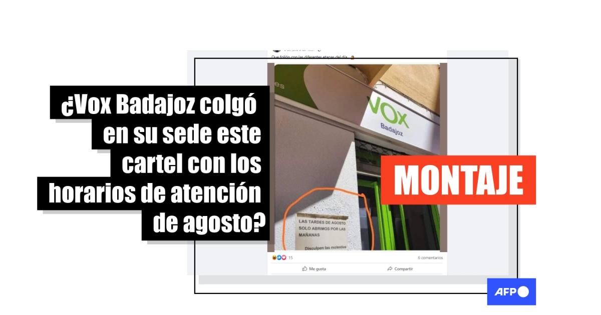 La fotografía, compartida en Facebook (1, 2) y Twitter, muestra la fachada de una sede del partido Vox en Badajoz con un supuesto cartel del horario de apertura durante agosto. Contenido similar circula en redes desde agosto de 2021 y también se difunde en catalán.
