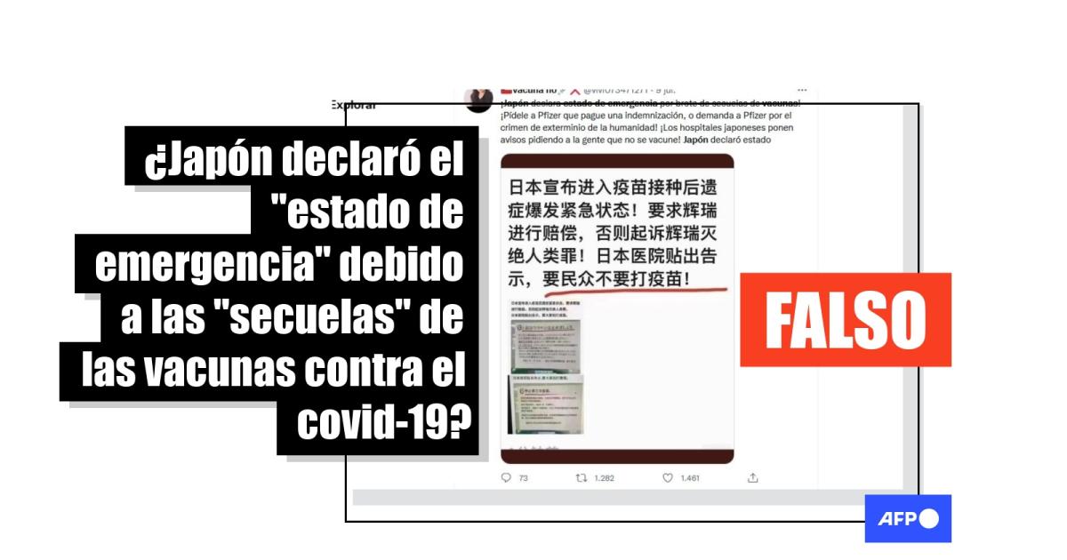 “¡Japón declara estado de emergencia por brote de secuelas de vacunas!”, se lee en entradas que circulan en Twitter y Facebook. “¡Pídele a Pfizer que pague una indemnización, o demanda a Pfizer por el crimen de exterminio de la humanidad! ¡Los hospitales japoneses ponen avisos pidiendo a la gente que no se vacune!”