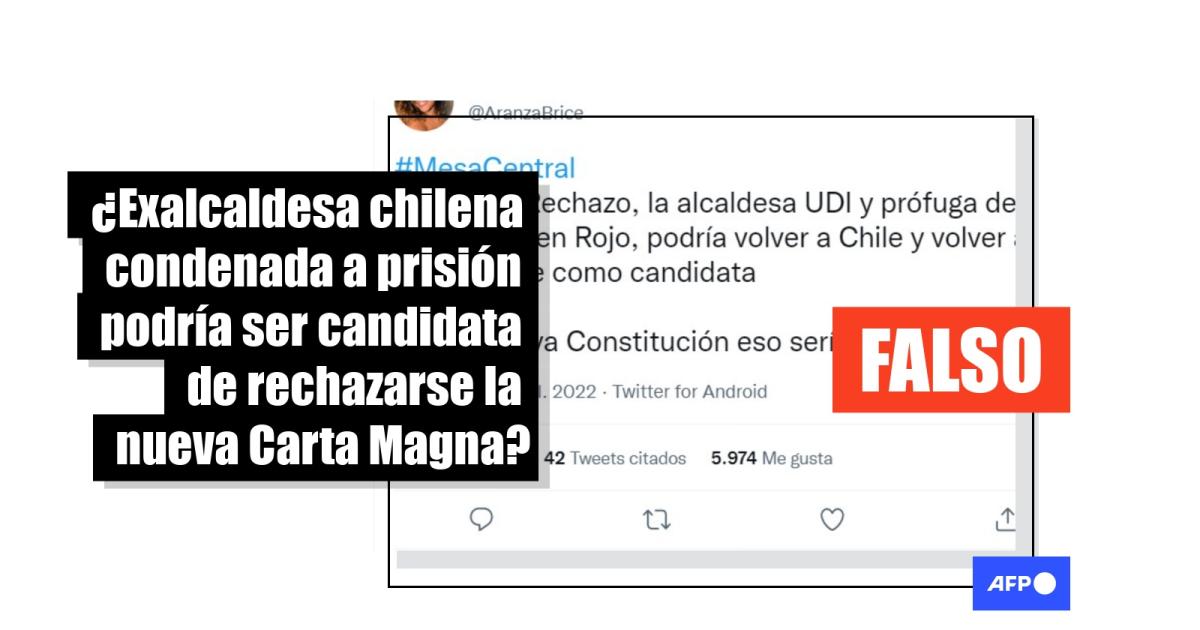 “Si gana el Rechazo, la alcaldesa UDI y prófuga de la justicia Karen Rojo, podría volver a Chile y volver a presentarse como candidata. Con la nueva Constitución eso sería IMPOSIBLE”, señala un tuit, que ha sido compartido como captura de pantalla en Facebook.