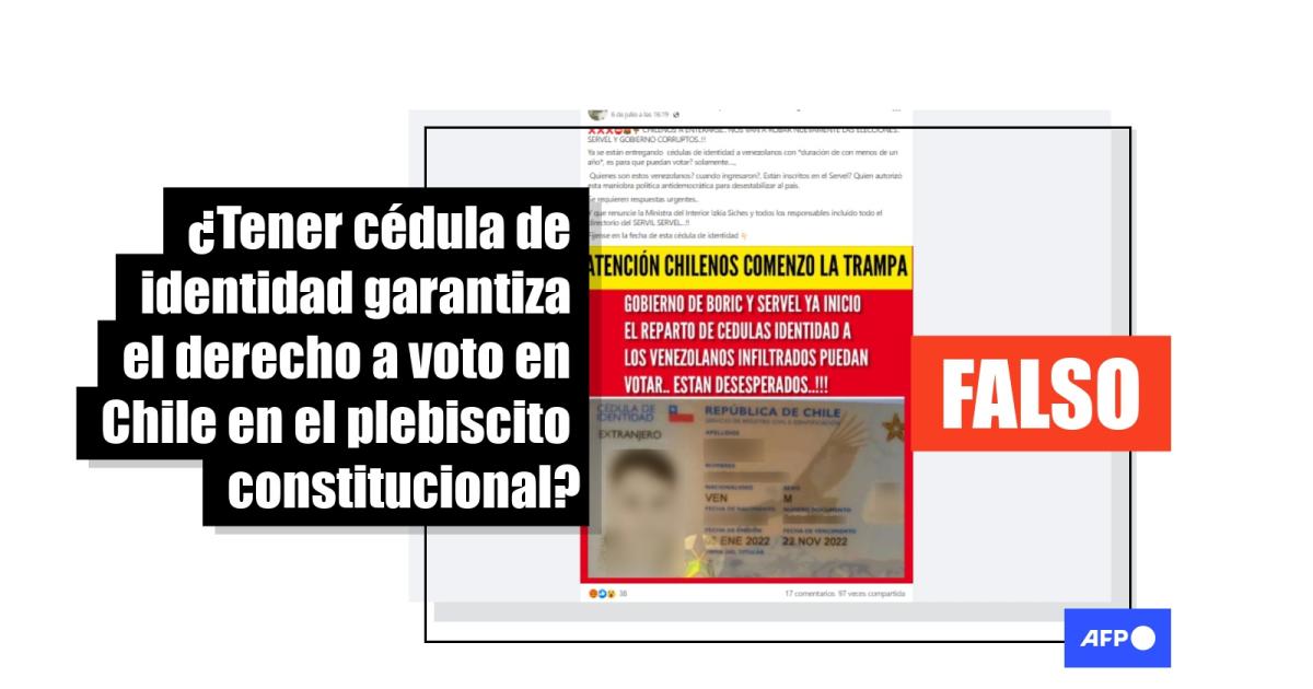 El artículo 14 de la Constitución de Chile señala que tienen derecho a sufragio “los extranjeros avecindados en Chile por más de cinco años”, es decir, que hayan permanecido en el país por más de ese tiempo y que cumplan con los requisitos señalados en el inciso primero del artículo 13, que estipula que hay que ser mayor de edad y no haber sido condenado a pena aflictiva. Ninguno de los artículos de la Carta Magna vincula el derecho a sufragio con la obtención de la cédula de identidad nacional, como indican las publicaciones.