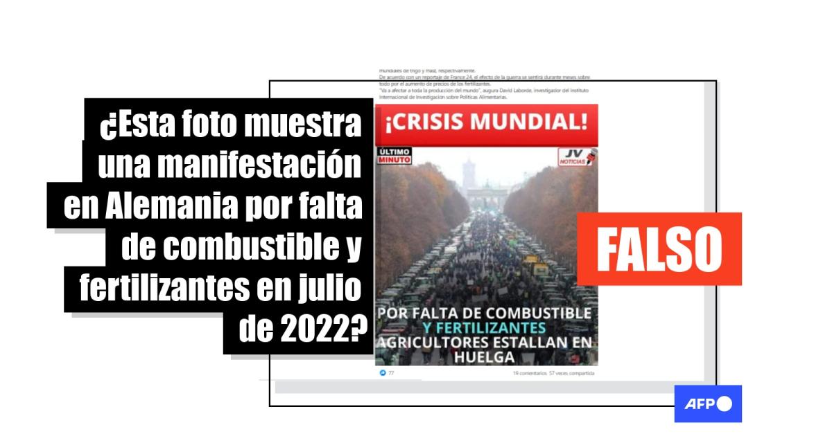 La invasión rusa de Ucrania, que inició el 24 de febrero pasado, provocó el aumento del precio del gas natural y del petróleo, así como de la escasez de productos agrícolas y alimenticios en Europa. Sin embargo, AFP Factual no encontró registro en julio de 2022 de alguna manifestación en Alemania con las características de la imagen viral y vinculada al conflicto bélico.