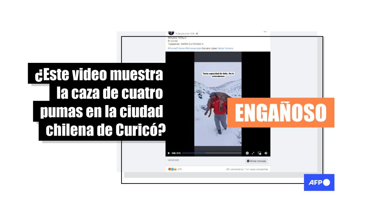 “CURICÓ: en rrss se difunde video de "cazadores" que mataron a 4 pumas y los llevan como trofeos. Se aprovecharon de la nevada para que los pumas bajaran y matarlos”, aseguran publicaciones en Facebook (1, 2) y en Twitter.