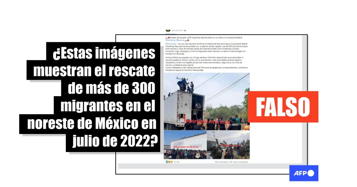 El área de comunicación del INM confirmó a AFP Factual que es falso que hayan sido rescatados más de 300 migrantes en la carretera que conecta a Reynosa, Tamaulipas, y Monterrey, Nuevo León, el pasado 24 de julio. En esa fecha fueron encontradas 225 personas de Centroamérica en una bodega en el Estado de México, a unos 970 km de Reynosa, indicó la dependencia migratoria.