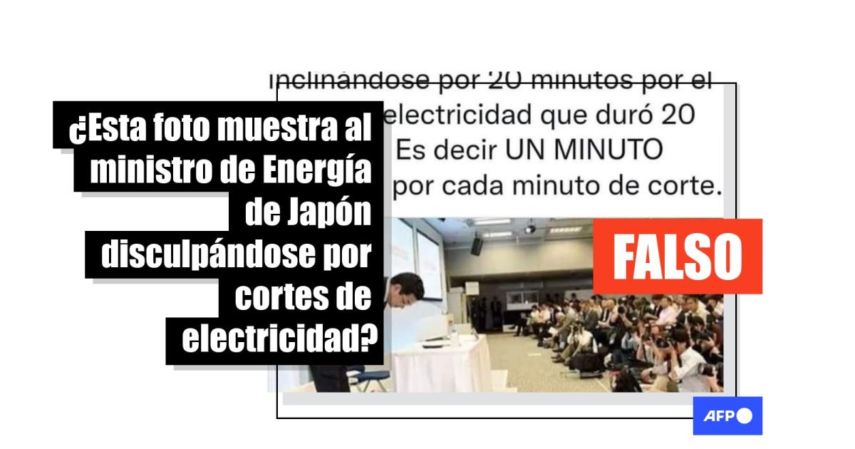 “Ministro de Energía de Japón se DISCULPA con el pueblo japonés inclinándose durante 20 minutos por el corte de electricidad que duró 20 minutos. Es decir UN MINUTO inclinado por cada minuto de corte”, señala el texto que acompaña la imagen difundida en Facebook (1, 2) y Twitter.