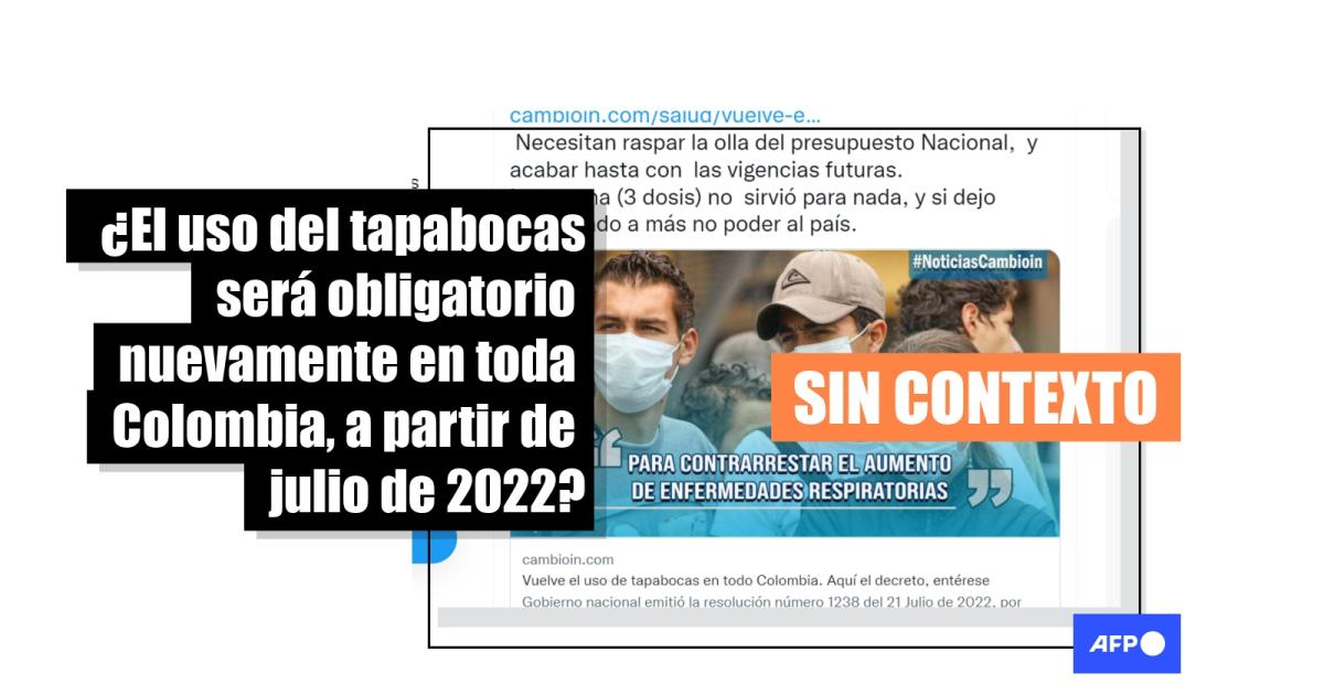 "Vuelve el uso del tapabocas en todo Colombia", dicen las entradas en Facebook (1, 2) y Twitter, que difunden el enlace a una nota de prensa con ese titular o sus capturas de pantalla.