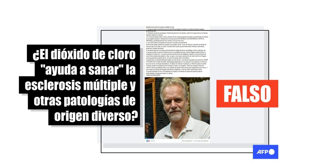 Consultado por los supuestos beneficios para tratar la esclerosis múltiple, la fibromialgia y la esclerosis lateral amiotrófica (ELA), el neurólogo Facundo Latini, investigador en la Unidad Ejecutora de Estudios en Neurociencias y Sistemas Complejos de Conicet, Argentina, recalcó que la condición que las origina no es la misma, como sugiere la publicación viral, y que “ninguna de las tres patologías se trata con dióxido de cloro”.