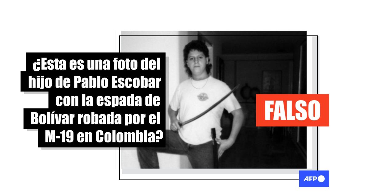 "En la foto, el hijo de PABLO ESCOBAR, Con la espada de Bolivar, que habia robado el M-19", dice una de las publicaciones en Facebook (1, 2) y Twitter.