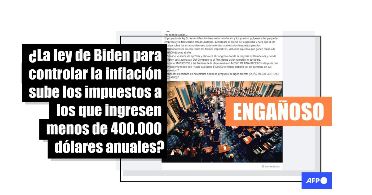 “El proyecto de ley Schumer-Manchin hará subir la inflación y los precios, golpeará a las pequeñas empresas y la fabricación estadounidense, aumentará el precio de la gasolina”, señalan entradas en Facebook (1, 2) que también añaden que aumentará “los impuestos para los estadounidenses en casi todos los tramos impositivos, incluidos aquellos que ganan menos de 400.000 dólares al año”. Las publicaciones también han sido compartidas en Twitter (1), donde aseguran que “bajo la nueva ley, todos los que ganan $30,000 al año o más pagarán más”.