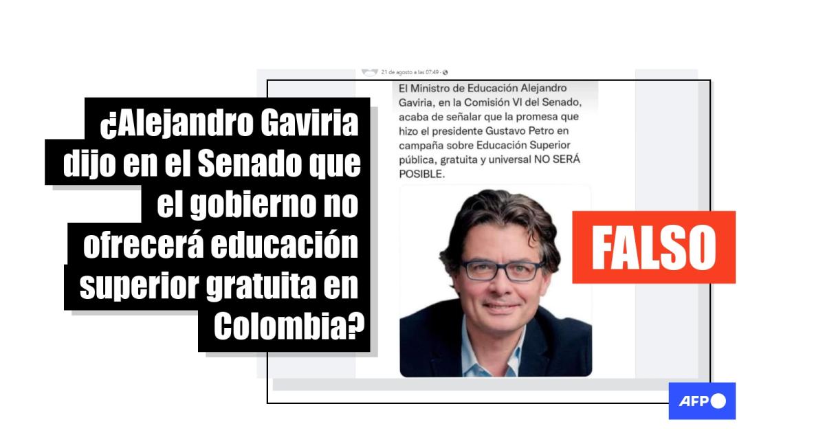 “El Ministro de Educación Alejandro Gaviria, en la Comisión VI del Senado, acaba de señalar que la promesa que hizo el presidente Gustavo Petro en campaña sobre Educación Superior pública, gratuita y universal NO SERÁ POSIBLE”, se lee en las entradas en Twitter (1, 2) y Facebook (1, 2, 3).