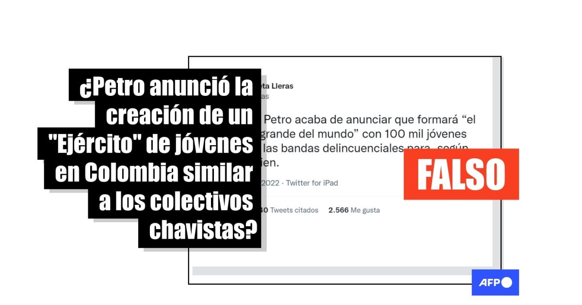 "El presidente Petro acaba de anunciar que formará ‘el ejército más grande del mundo’ con 100 mil jóvenes que están en las bandas delincuenciales para, según él, que estudien", dicen algunos mensajes en Facebook (1, 2) y Twitter (1, 2).