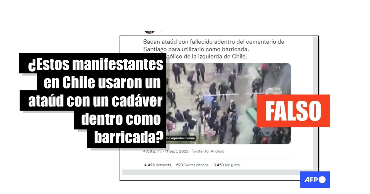“Sacan ataúd con fallecido adentro del cementerio de Santiago para utilizarlo como barricada. Nivel diabólico de la izquierda de Chile”, dicen publicaciones en Twitter y Facebook.
