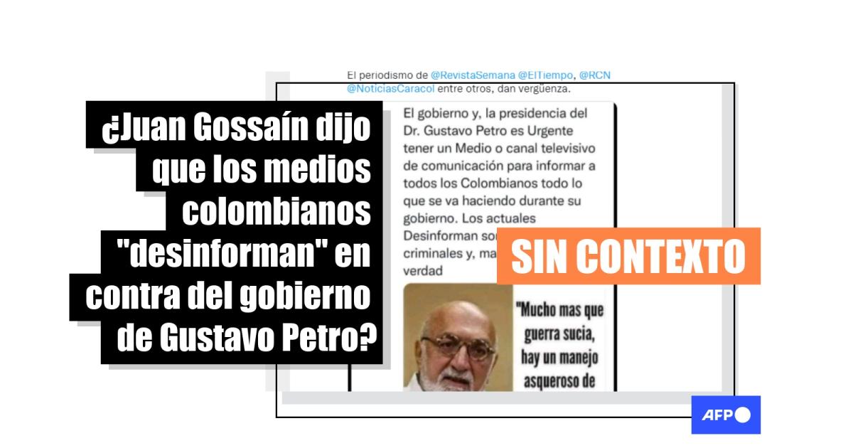 "El gobierno, y la presidencia del Dr. Gustavo Petro es Urgente tener un Medio o canal televisivo de comunicación para informar a todos los Colombianos todo lo que se va haciendo durante su gobierno. Los actuales Desinforman son periodismo criminales y, manipuladores de la verdad ‘Mucho mas que guerra sucia, hay un manejo asqueroso de la prensa’ Juan Gossain", dice el texto de una imagen difundida en Facebook (1, 2), Instagram y Twitter (1, 2).