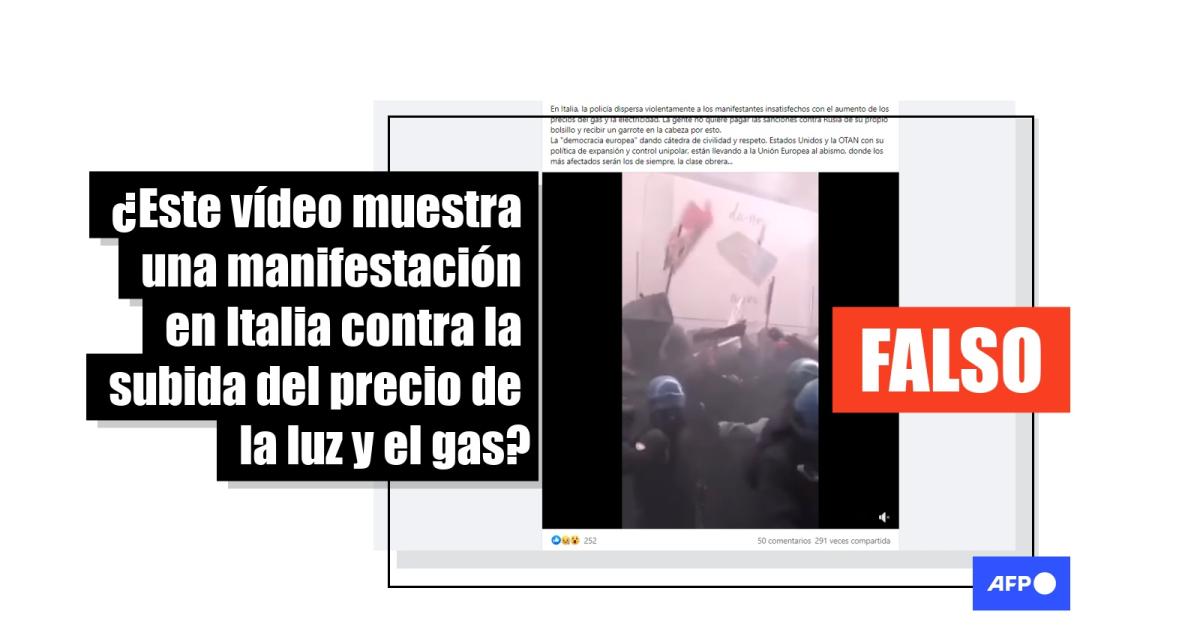“En Italia, la policía dispersa violentamente a los manifestantes insatisfechos con el aumento de los precios del gas y la electricidad. La gente no quiere pagar las sanciones contra Rusia de su propio bolsillo”, aseguran publicaciones en Facebook con la grabación, de menos de 20 segundos, de una manifestación.