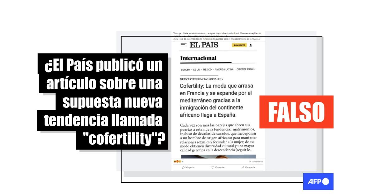 Según el meme viral, El País habría titulado: “Cofertility: La moda que arrasa en Francia y se expande por el mediterráneo gracias a la inmigración del continente africano llega a España”. El contenido hace referencia a una “nueva tendencia” de las parejas que incorporan en su relación a una persona de origen africano para que fecunde a la mujer y así tener una “mayor calidad genética en la descendencia”, señala el subtítulo.