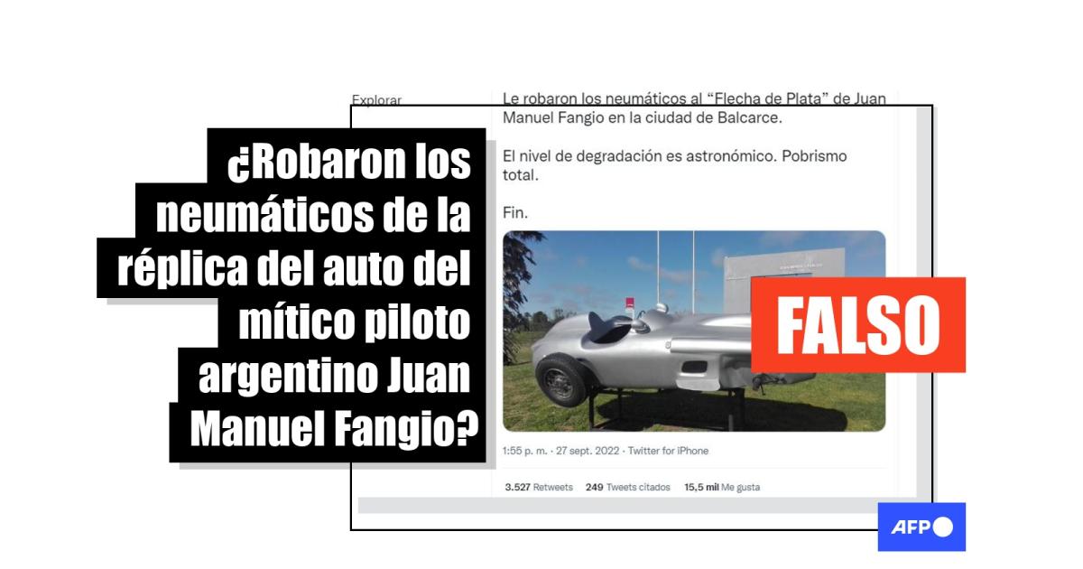 “Le robaron los neumáticos al ‘Flecha de Plata’ de Juan Manuel Fangio en la ciudad de Balcarce. El nivel de degradación es astronómico. Pobrismo total.Fin.”, denuncian publicaciones compartidas más de 5.000 veces en tan solo 24 horas en Twitter (1, 2) y Facebook (1, 2).