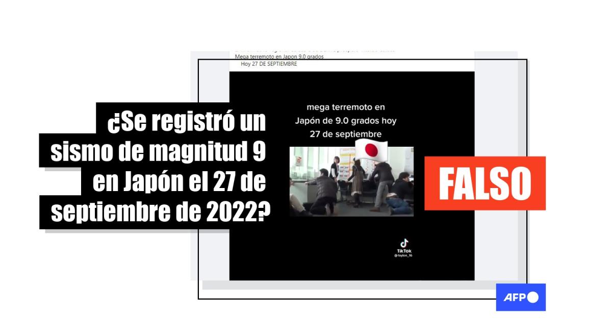 Pero la Agencia Meteorológica de Japón no tiene registro de un sismo de magnitud 9 ocurrido el 27 de septiembre de 2022 en ese país. En esa fecha se registraron dos terremotos, el mayor de 3,4. No se encontraron reportes de daños o heridos provocados por la actividad telúrica en Japón en ese día.