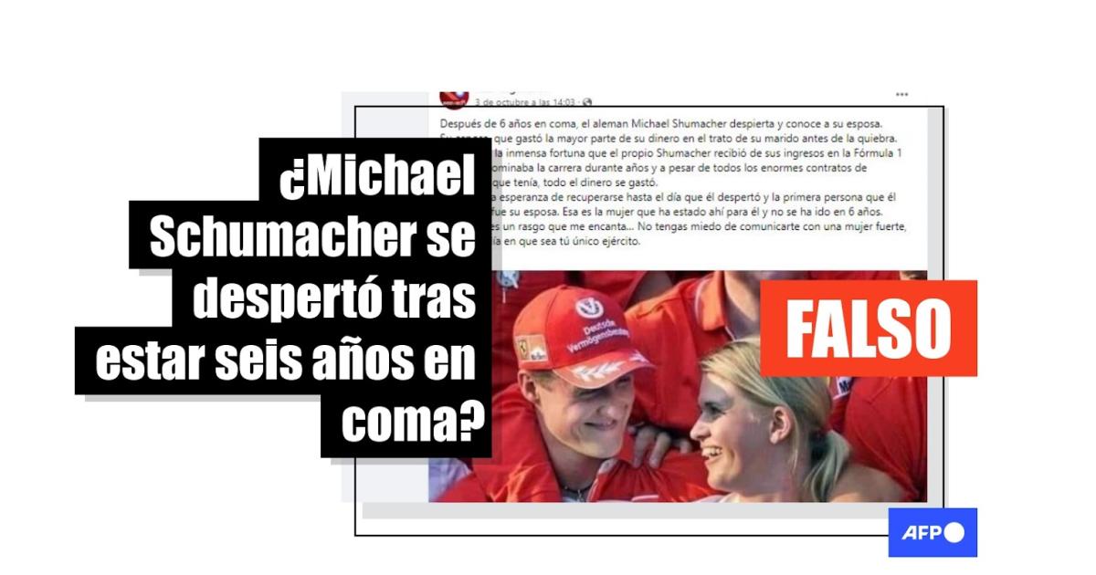 El mensaje circula desde mediados de 2021 pero volvió a viralizarse en octubre de 2022 en Facebook (1, 2) e Instagram (1, 2): “Después de 6 años de coma, el alemán Schumacher se despierta y se encuentra con su esposa. Su esposa que gastó la mayor parte de su dinero en el tratamiento de su marido antes de la quiebra. A pesar del gran dinero que Schumacher obtuvo de sus ingresos en la Fórmula 1 mientras dominaba la carrera durante años y a pesar de todos los grandes contratos de patrocinio que tenía, todo el dinero se gastó. Estaba perdiendo la esperanza de recuperación hasta que un día se despertó y la primera persona que conoció fue su esposa. Esta es la mujer que ha estado ahí para él y no ha salido en todos estos 6 años…”