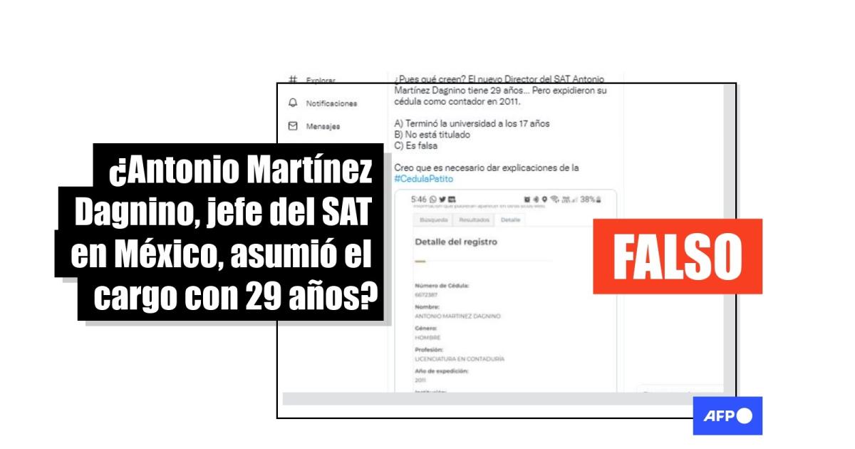 “¿Pues qué creen? El nuevo Director del SAT Antonio Martínez Dagnino tiene 29 años… Pero expidieron su cédula como contador en 2011. A) Terminó la universidad a los 17 años B) No está titulado C) Es falsa. Creo que es necesario dar explicaciones de la #CedulaPatito”, señalan publicaciones en Twitter (1, 2), Facebook (1, 2) e Instagram.