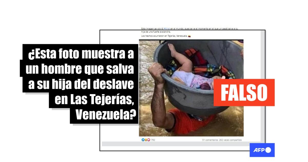 “Esta imagen se volvió #Viral en el mundo, pues se ve el momento en el que un papá salva a su hija de una fuerte avalancha. Los hechos ocurrieron en Tejerías, Venezuela”, se lee en las entradas en Facebook (1, 2).