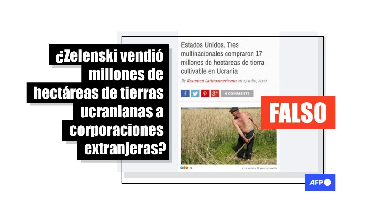 "Zelensky ‘vendió’ 17 millones de hectáreas de tierras agrícolas a Monsanto, Dupont y Cargill. Sí... lo leíste bien…”, asegura una publicación en Facebook, en la que se detalla que la venta fue efectuada debido al endeudamiento del país.