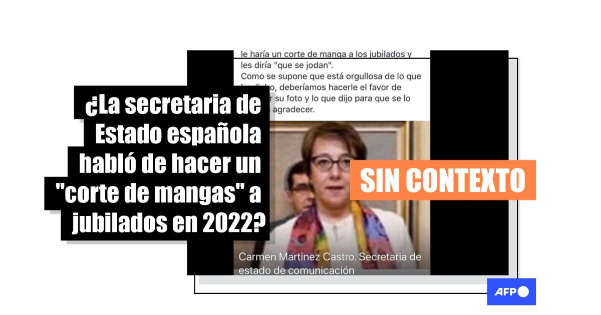 “Esta… digamos mujer, es la que ha dicho que les haría un corte de manga a los jubilados y les diría ‘que se jodan’”, dicen las entradas compartidas en Facebook, que identifican en la foto a la mujer como “Carmen Martinez Castro. Secretaria de estado de comunicación” sin dar más datos sobre las circunstancias de las declaraciones.