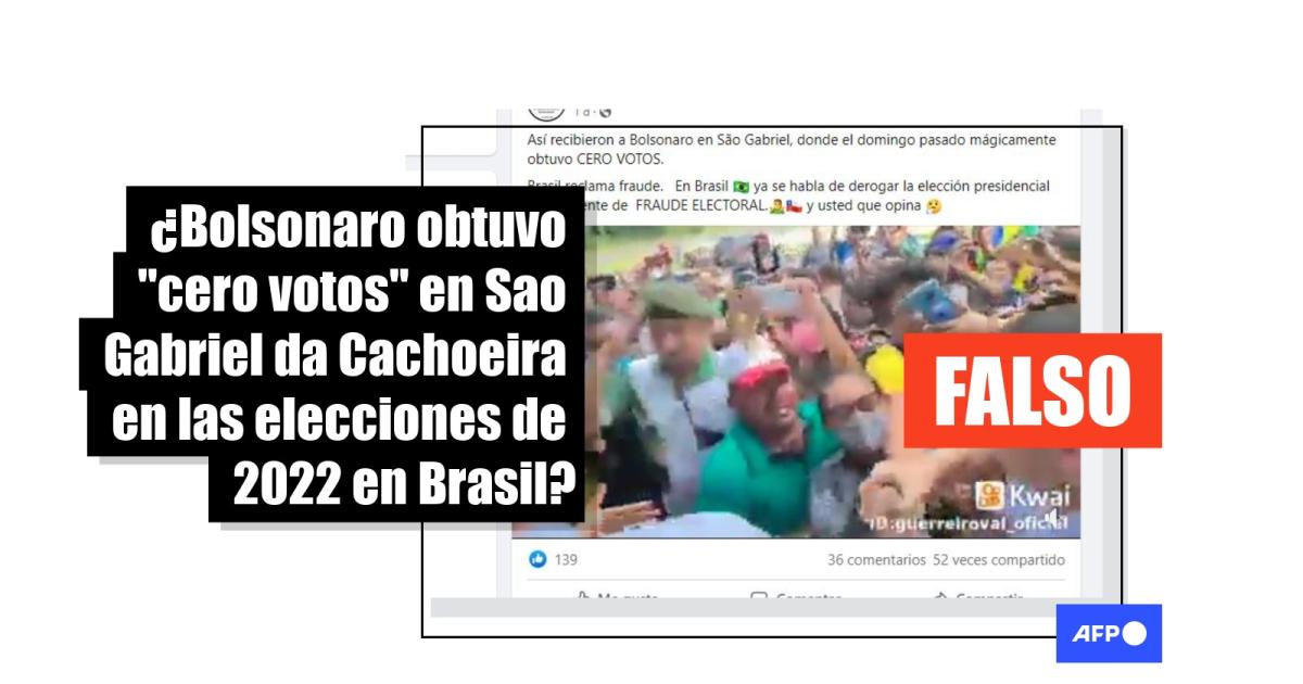 “Así recibieron a Bolsonaro en São Gabriel, donde el domingo pasado mágicamente obtuvo CERO VOTOS”, rezan publicaciones en Facebook (1, 2), Instagram y Twitter (1, 2) que incluyen un video, o una imagen, en los que se ve a Bolsonaro siendo saludado por una multitud. “En Brasil ya se habla de derogar la elección presidencial por evidente de FRAUDE ELECTORAL”, agregan.