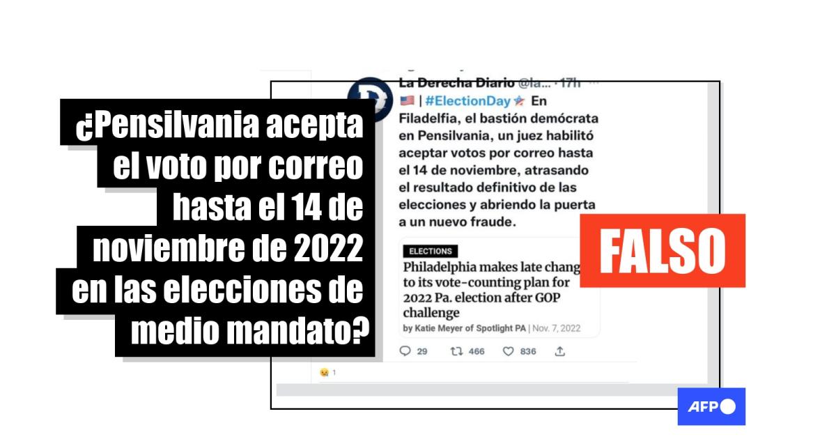 Las afirmaciones de que un juez dictaminó extender el plazo para las boletas por correo hasta el 14 de noviembre son falsas, según Ellen Lyon, portavoz del Departamento de Estado de Pensilvania. “Esto no es cierto y es desinformación”, dijo a la AFP.