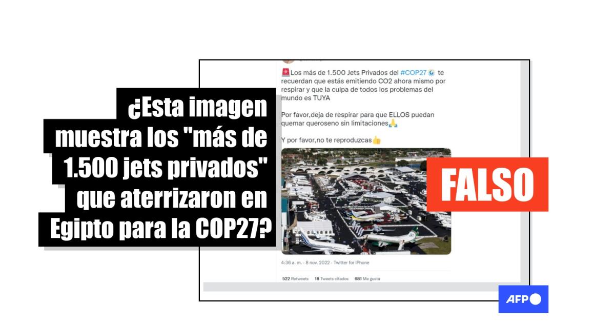 Las publicaciones también aseguran que, para la COP27, los asistentes usaron “más de 1.500 jets privados”. Sin embargo, “más de 400 aviones privados aterrizaron en los últimos días en Egipto”, dijo el 10 de noviembre de 2022 a la AFP una fuente cercana a las autoridades de aviación del país, que pidió no ser identificada. “Hubo una reunión antes de las COP27, y los funcionarios esperaban esos aviones e hicieron algunos arreglos en el aeropuerto de Sharm el Sheij para recibirlos”, agregó.
