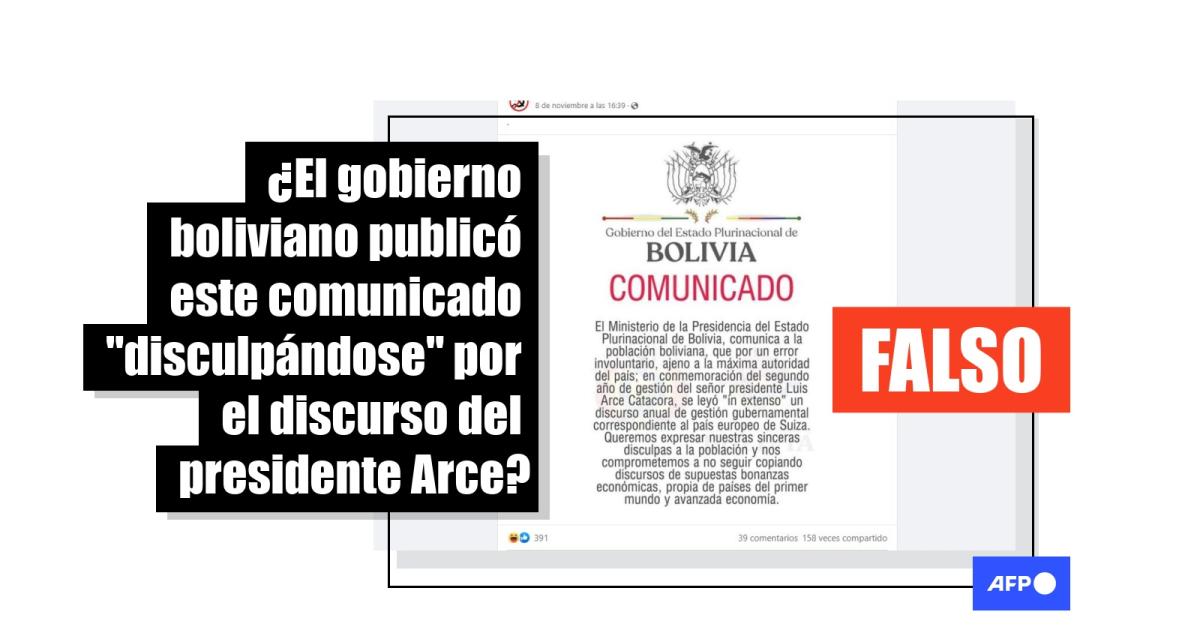 “El Ministerio de la Presidencia del Estado Plurinacional de Bolivia, comunica a la población boliviana, que por un error involuntario, ajeno a la máxima autoridad del país; en conmemoración del segundo año de gestión del señor presidente Luis Arce Catacora, se leyó ‘in extenso’ un discurso anual de gestión gubernamental correspondiente al país europeo de Suiza”, se lee en un supuesto comunicado de la Presidencia de Bolivia, tras un discurso realizado por Arce para la nación.