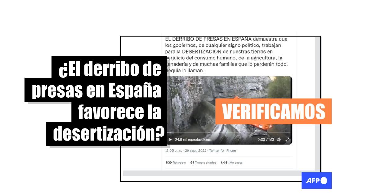 “En absoluto en España se derriban presas y embalses en uso”, contestó por correo electrónico a las preguntas de AFP Factual César Rodríguez, secretario general de la Asociación para el Estudio y Mejora de los Salmónidos (AEMS) - Ríos con Vida, en lo que coincide con Flores: “No se están derribando las presas”.