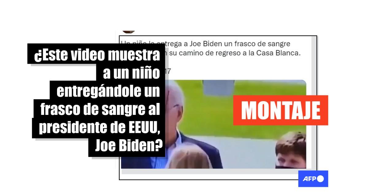 “Un niño le entrega a Joe Biden un frasco de sangre para beber en su camino de regreso a la Casa Blanca”, dice una de las publicaciones que circulan en Twitter (1, 2) y Facebook (1, 2, 3).