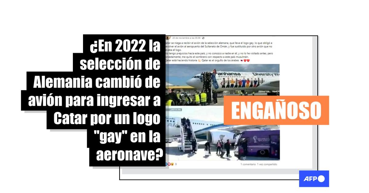 “Qatar se niega a recibir el avión de la selección alemana, que lleva el logo gay, lo que obligó a devolver el avión al aeropuerto del Sultanato de Omán [de donde procedía] y fue sustituido por otro avión que no llevaba el logo”, dicen las publicaciones en Facebook (1, 2) y Twitter (1, 2), algunas de ellas compartidas junto a dos fotografías que respaldarían estas afirmaciones.