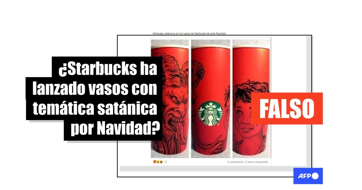 “Mensajes satánicos en los vasos de Starbucks de esta Navidad”, señalan entradas en Facebook (1, 2) y Twitter que difunden la imagen de un vaso con distintas ilustraciones y el logotipo de Starbucks.