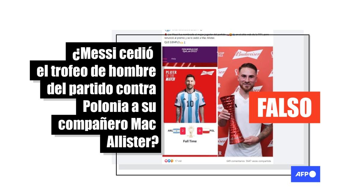 El mensaje informaba que “los esfuerzos de Mac Allister fueron recompensados por Lionel Messi”. Según el mensaje, Messi “recibió de la FIFA el trofeo de Hombre del Partido [MOTM, por las siglas de en inglés Man Of The Match] contra Polonia” y luego “se lo entregó a Mac Allister”. Sin embargo, la AFP no encontró ninguna mención en medios de comunicación reputados que indicara que Lionel Messi habría ofrecido su propio trofeo a uno de sus compañeros.