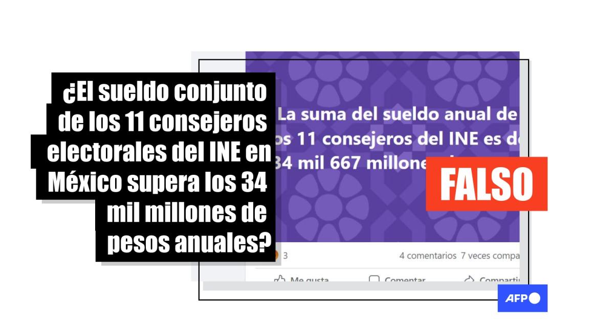 “La suma del sueldo anual de los 11 consejeros del INE es de 34 mil 667 millones de pesos”, dicen publicaciones en Twitter y Facebook (1, 2). El monto, de acuerdo con el cambio al 12 de diciembre de 2022, corresponde a 1.749 millones de dólares.