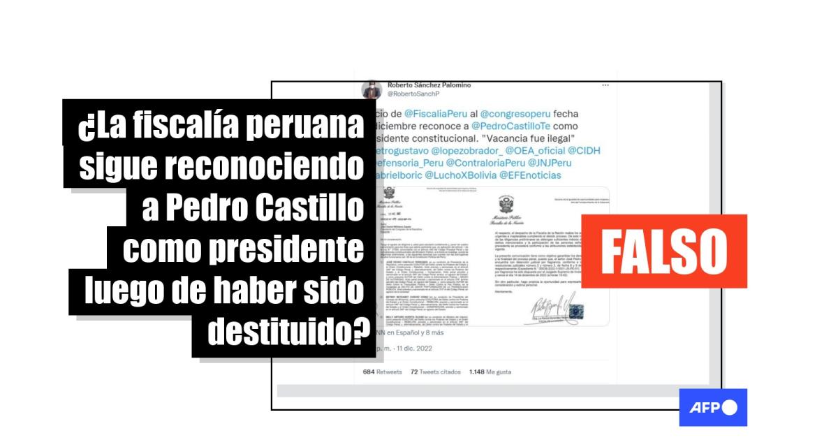 “Oficio de @FiscaliaPeru al @congresoperu fecha 10 diciembre reconoce a @PedroCastilloTe como Presidente constitucional. ‘Vacancia fue ilegal’”, se lee en un tuit del congresista y exministro del gobierno de Pedro Castillo, Roberto Sánchez Palomino, que suma más de 2.000 interacciones, y que fue posteriormente eliminado.