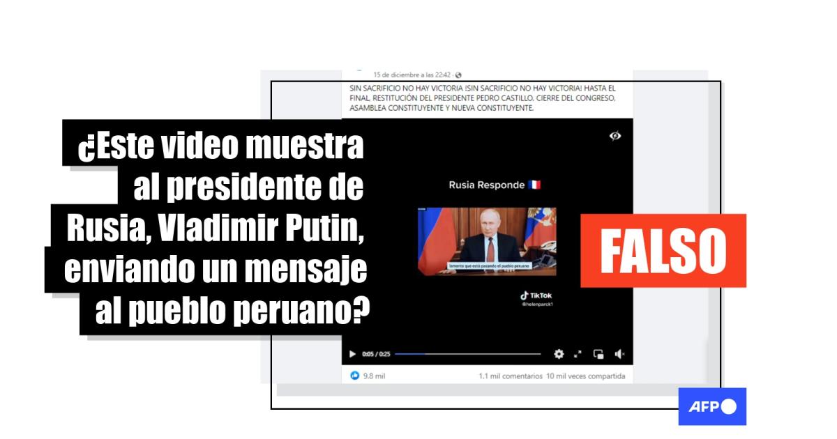 "Lamento lo que está pasando el pueblo peruano" se lee en los subtítulos del video, que circula en Facebook, TikTok y Twitter. “Perú siempre fueron nuestros socios y nunca los daremos la espalda (...) Ago responsable a la presidenta del Perú por los actos que se está pasando en el Perú”, dice, supuestamente, Vladimir Putin en esa grabación.