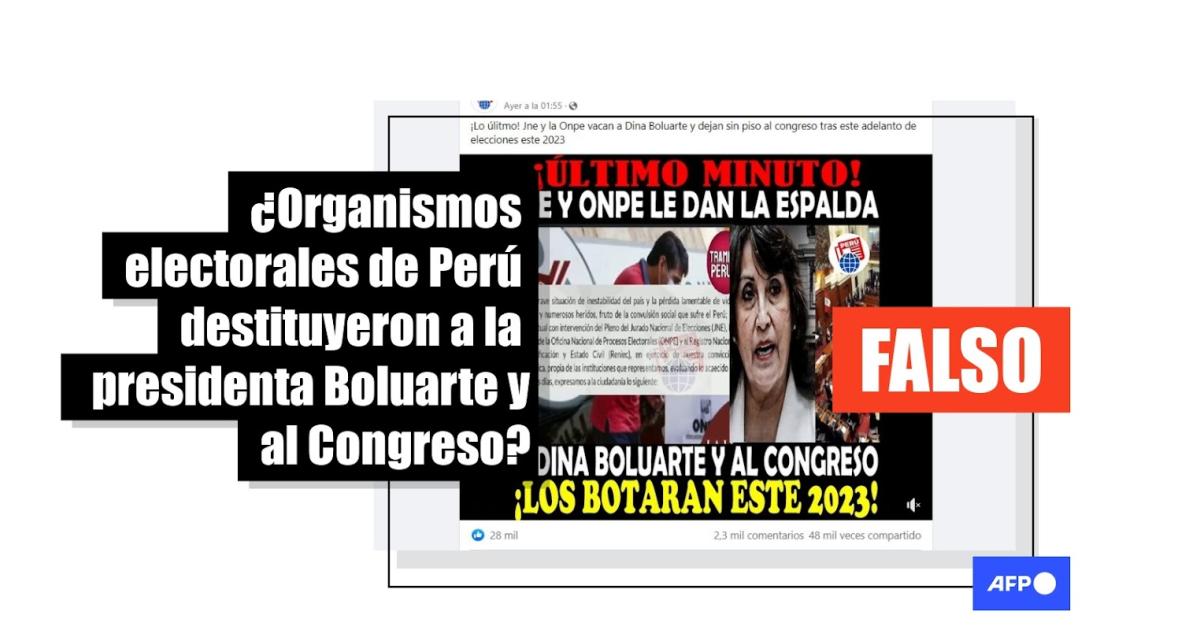 “Atención. Los organismos responsables del sistema electoral han dejado sin piso a Dina y al Congreso con un comunicado de último minuto para vacarlos y adelantar elecciones para este 2023” dice una voz en off masculina en un video que circula en Facebook (1, 2), YouTube, Twitter y TikTok.