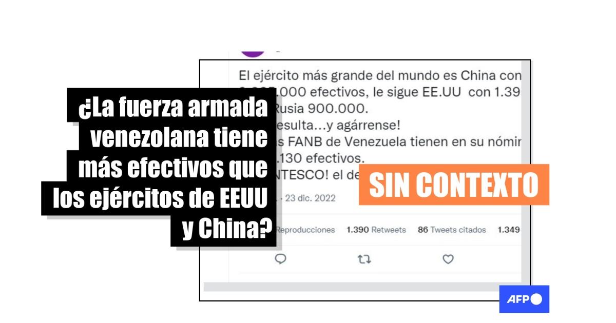 La Fuerza Armada Nacional Bolivariana de Venezuela (FANB) tiene más de 4,4 millones de efectivos, según datos oficiales. Sin embargo, no es posible establecer una comparación entre su tamaño y el de los ejércitos de China y Estados Unidos, como proponen entradas compartidas en redes sociales más de 2.400 veces desde el 23 de diciembre de 2022. La cifra venezolana incluye a la Milicia Bolivariana, un grupo secundario y de carácter reservista, mientras que los números chinos y estadunidenses corresponden a militares profesionales y en servicio.