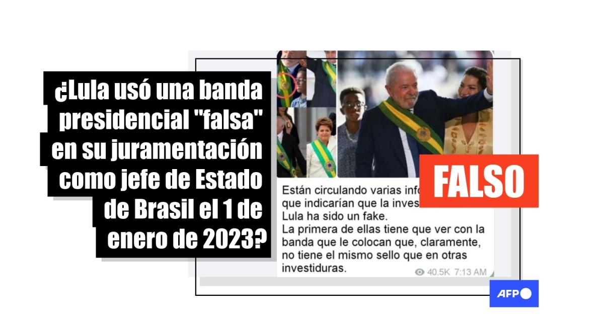 “Están circulando varias informaciones que indicarían que la investidura de Lula ha sido un fake. La primera de ellas tiene que ver con la banda que le colocan que, claramente, no tiene el mismo sello que en otras investiduras”, dicen las publicaciones difundidas en Twitter, Telegram y Facebook (1, 2).