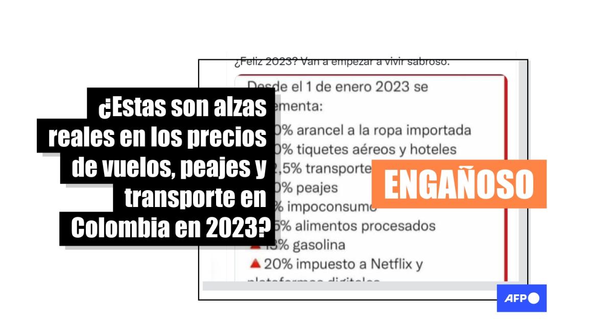 "Desde el 1 de enero 2023 se incrementa: 40% arancel a la ropa importada, 40% tiquetes aéreos y hoteles, 12,5% transporte público, 20% peajes, 8% impoconsumo, 25% alimentos procesados, 13% gasolina, 20% impuesto a Netflix y plataformas digitales", dice un mensaje compartido más de 5.000 veces en Twitter (1, 2) y Facebook desde el 29 de diciembre de 2022.