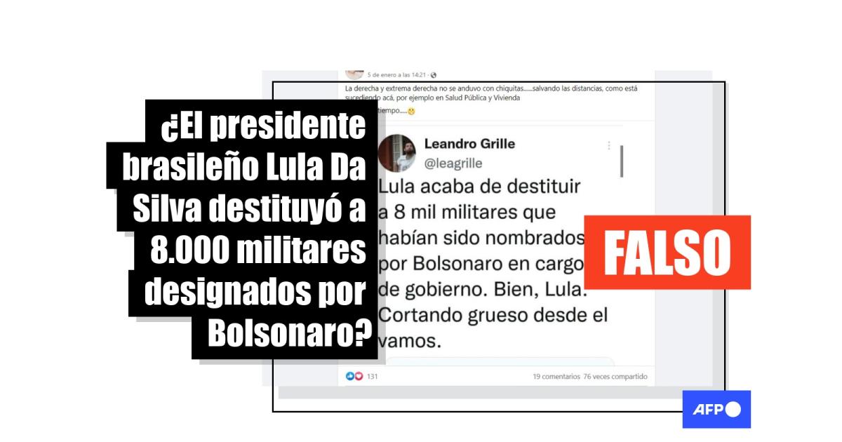 “Lula acaba de destituir a 8 mil militares que habían sido nombrados por Bolsonaro en cargos de gobierno. Bien, Lula”, dice un tuit, cuya captura de pantalla se compartió también en Facebook (1, 2).