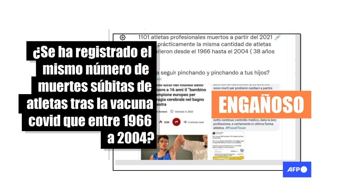 "1101 atletas profesionales muertos a partir del 2021, prácticamente la misma cantidad de atletas que murieron desde el 1966 hasta el 2004( 38 años ….) Te vas a seguir pinchando y pinchando a tus hijos?”, dicen publicaciones en Twitter y Facebook (1, 2, 3) desde el 4 de enero de 2023.