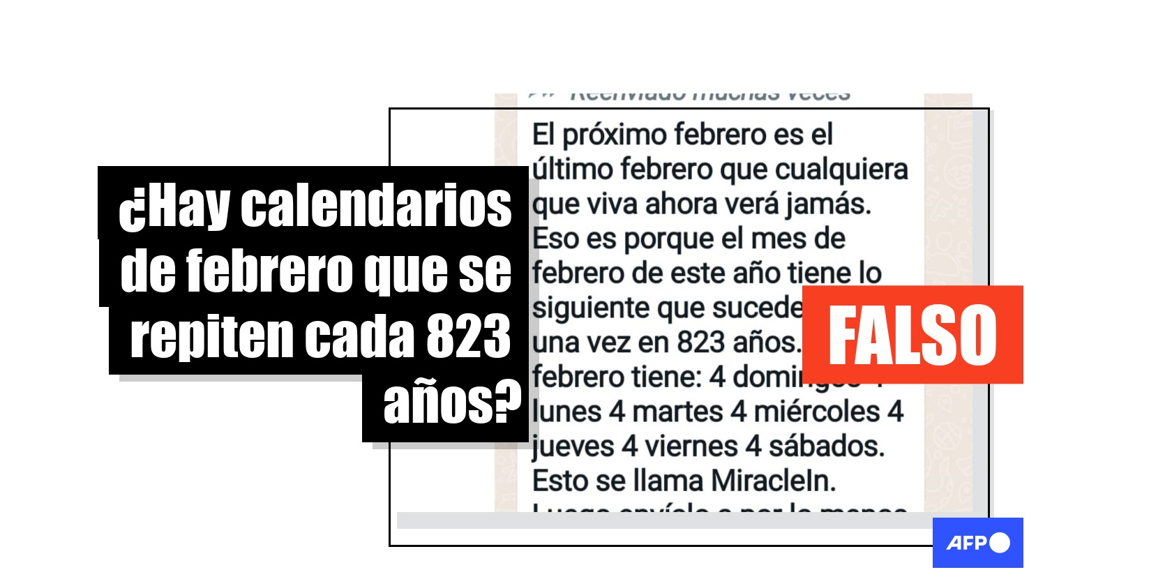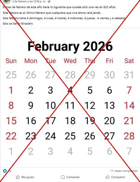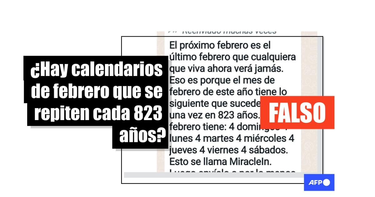 Cada febrero, excepto en años bisiestos, los días de la semana se repiten cuatro veces. Es decir, en ese mes suceden cuatro lunes, martes, miércoles, jueves, viernes, sábados y domingos. Entradas en redes sociales compartidas más de 14.000 veces desde 2019 y que han vuelto a circular en 2026 afirman que es un fenómeno exclusivo de “este año”, el cual "sucede una vez cada 823 años". A partir de registros de calendarios pasados, la AFP corroboró que eso no es cierto.