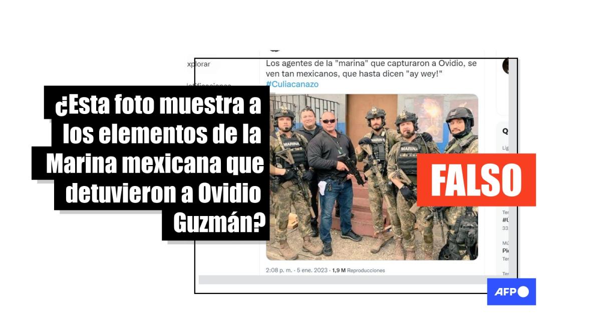 “Los agentes de la ‘marina’ que capturaron a Ovidio, se ven tan mexicanos, que hasta dicen ‘ay wey!’ #Culiacanazo”, dice una de las publicaciones en Facebook y Twitter (1, 2, 3) que difunden la imagen de un grupo de seis hombres uniformados, cinco de ellos con armas.