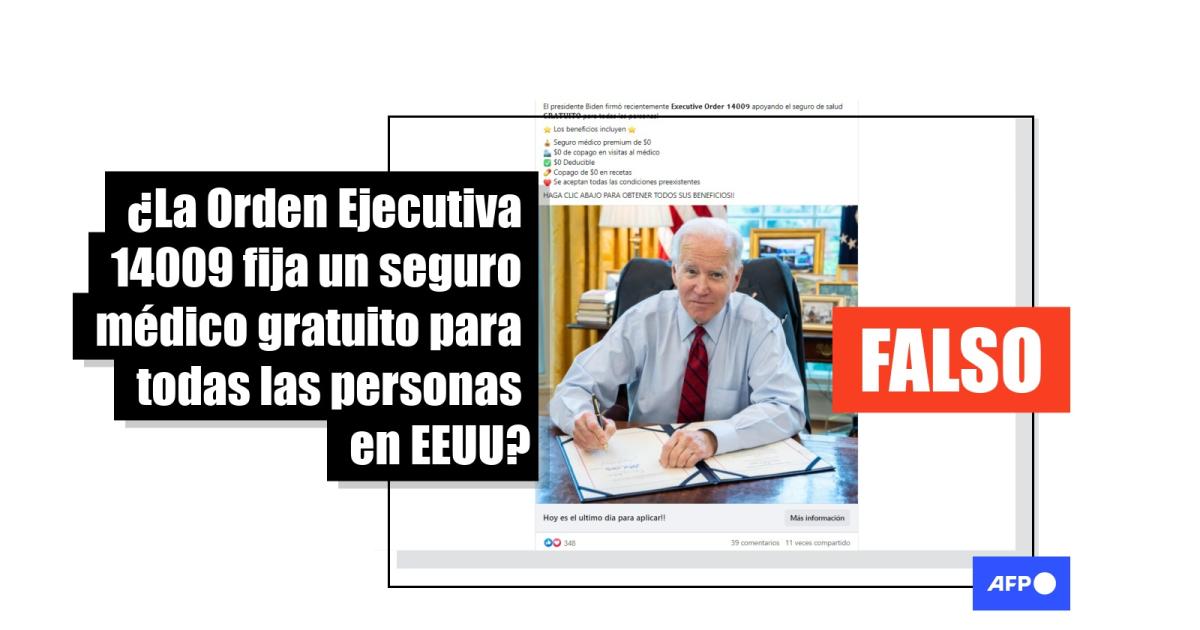 “El presidente Biden firmó recientemente Executive Order 14009 apoyando el seguro de salud GRATUITO para todas las personas!”, señala una de las entradas difundidas en Facebook.